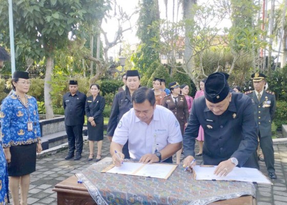 GIANYAR, NusaBali - Pemerintah Kabupaten Gianyar memperkuat sinergi lintas lembaga melalui penandatanganan Nota Kesepakatan dan Perjanjian Kerja Sama dengan Badan Pusat Statistik (BPS) Kabupaten Gianyar dan Rencana Kerja dengan BPJS Kesehatan Kantor Cabang Klungkung. Kegiatan ini dilaksanakan di halaman Kantor Bupati Gianyar, Senin (22/12) pagi. Nota Kesepakatan ditandatangani oleh Bupati Gianyar I Made Mahayastra bersama Kepala BPS Kabupaten Gianyar Maria Iin Maidiana.